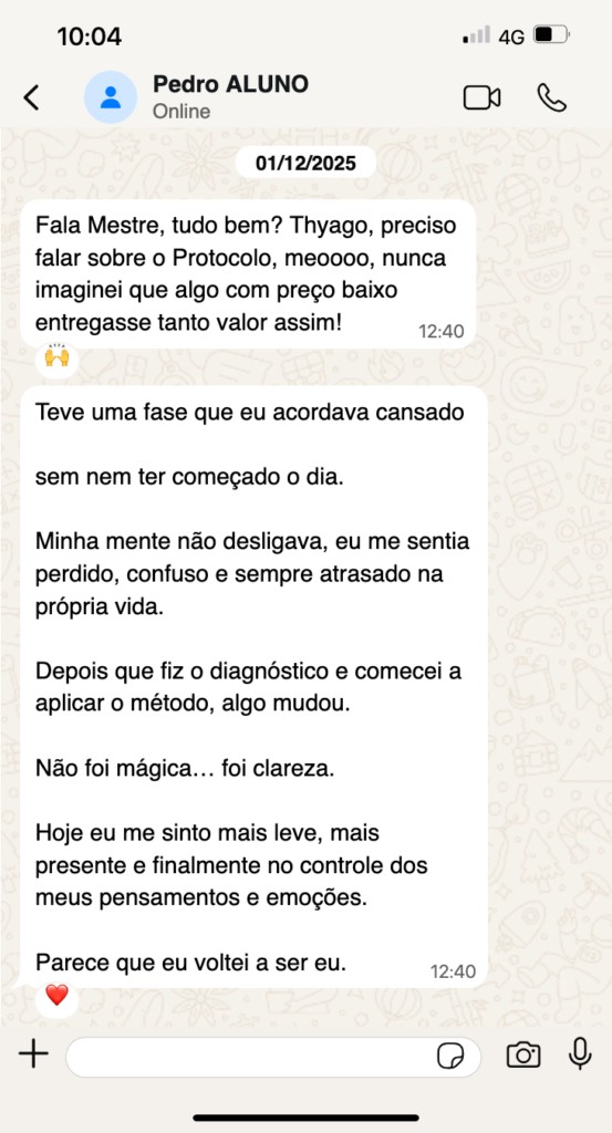 Você vai sentir sua mente acalmando, seus gatilhos perdendo força e sua cabeça ficando mais leve. A cada dia, a confusão mental diminui, o controle aumenta e você começa a pensar com mais clareza. Em uma semana, você já nota uma diferença enorme na forma como reage às situações.